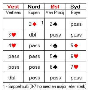 Espen valgte å åpne med søppelmulti, som normalt viser 0-7 honnørpoeng, med 8-poengeren i nord. Boye la seg på lur i busken med den enorme hjertertilpasninga. Han kunne riktignok ikke være 100 % sikker på at makker hadde hjerter etter 2 spar inn fra øst. Men da vest viste spartilpasning var det i alle fall ikke tvil om hvilken farge multiåpninga var basert på. Espens dobling regner jeg med viste god hjerterfarge. Boye tok det fortsatt rolig, men kom tilbake med en noe spektakulær 5 ruter over 4 spar fra øst. Kanskje var det for å prøve å få det til å se ut til at hjertertilpasninga ikke var riktig så formidabel. Om han fikk motparten til å tro på dette ville de kanskje bli mer fristet til å doble?