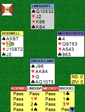 Mens Rodwell gikk inn med 2 hjerter ved det andre bordet, valgte Nils å passe. Det kommer kanskje ikke som noen overraskelse at jeg har sansen for Nils valg om å melde pass. Det er riktig å være med om det finnes hjertertilpasning, men om så ikke er tilfelle kan det fort være tungt å spille kontrakt øst-vest. Det verste er at vest kan ha en del kort, og dermed nok til å melde over 2 hjerter, uten at noen av honnørene er virksomme for øst. Da risikerer man å komme enda høyere enn 2-trinnet.