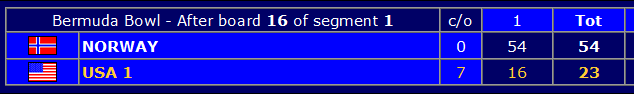 Merk at Norge vant settet med 38 IMP, men fikk 7 IMP i straff på grunn av sein spilling ved Espen og Boyes bord. Dermed er altså ledelsen justert fra 54-16 til 54-23.