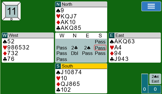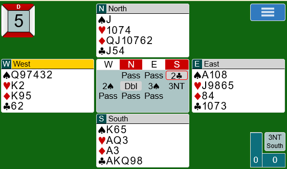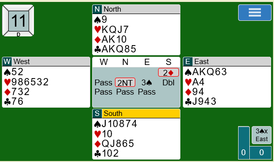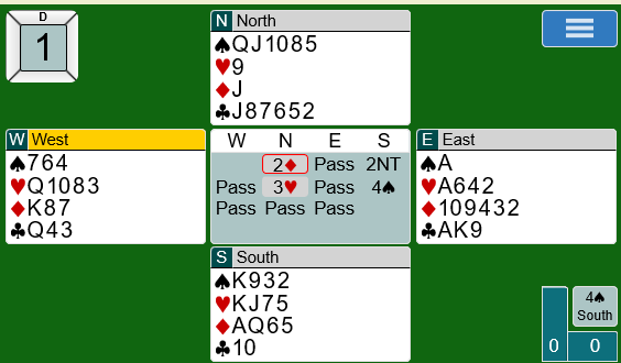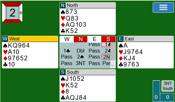 Espen (nords) 1 hjerter viste 4+ spar (overføring over 1 kløver), og da syd sa 1 spar (=3) løftet Espen til 2 spar som typisk viser at han har femkorts spar, men ikke mer enn ca. 8-9 poeng. Syds 3 hjerter viste rundt 15-16 og var naturlig, og Espen mente det var nok for utgang.