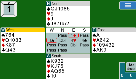 1 ruter fra Nils i øst var presisjon (11-15 hp, minst 1 ruter), mens 1 spar fra Ulf viste minst 4-korts hjerter. Syd var naturlig nok med til 4 spar etter at makker hadde vist sparfarge. Det er forståelig at Nils doblet sluttkontrakten. Det kunne se ut som han hadde fire stikk på egen hånd.