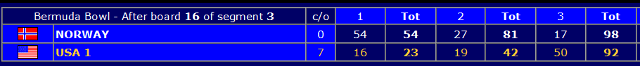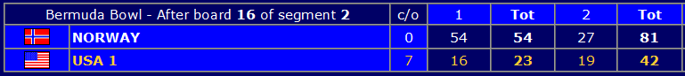 Bronsefinalen mellom Norge og USA 1 er vidåpen før de to siste settene, som spilles lørdag. Norge fikk en strålende start da de vant første sett med 38 IMP. Imidlertid ble det 7 IMP i straff for sein spilling, og dermed var ledelsen på 31 IMP etter det første av fem sett. I andre sett økte Norge med 8 IMP, mens amerikanerne våknet for alvor i siste sett. Etter at de vant settet med 33 IMP er ledelsen knappet ned til 6 IMP før lørdagens 32 spill. Du kan følge avslutninga direkte på BBO. Norge stiller med Espen - Boye og Nils - Ulf i morgensettet. Vi får håpe det norske laget avslutter mesterskapet på beste vis slik at bronsemedaljene sikres!