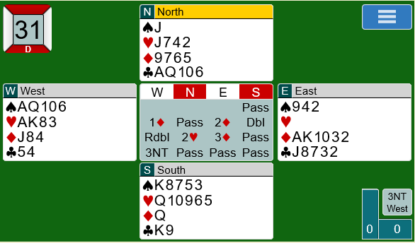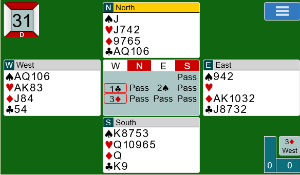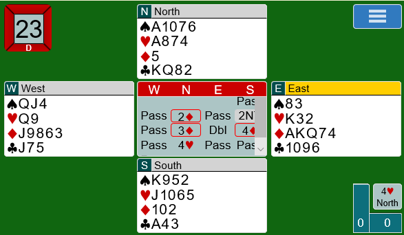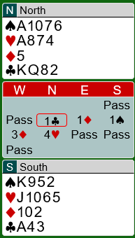 2 ruter fra nord viste trefargehånd med kortfarge i ruter og normal åpningsstyrke. Det ble buttspill etter at også amerikaneren vant 4 hjerter.