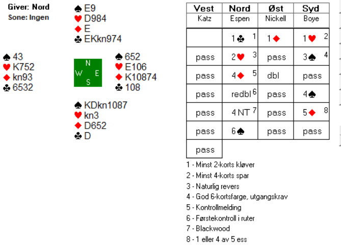 I spill 20 ble det meldt 4 spar ved begge bord. Espen ble spillefører i øst etter følgende meldingsforløp:
