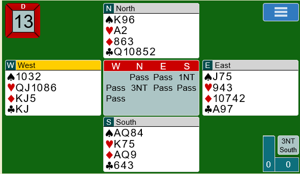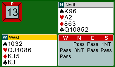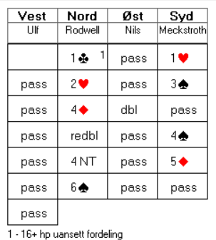Det var ikke enkelt å spille ut hjerter etter at nord hadde vist hjerterfarge, og øst hadde ønsket et sterkt ønske om ruter ut. Det ble da også spilt ut ruter ved begge bord. Kontrakten gikk hjem etter at trumfen ble trukket ut og kløver dame stukket over. Kløveren ga nok stikk så lenge ikke en av motstanderne hadde utstyrt seg med tieren fjerde i kløver. Buttspill.