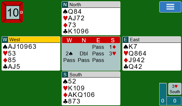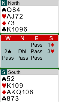 Terje hadde valget mellom å gjenta ruteren eller melde hjerter på 3-kortsfarge etter at vest hadde vært inne med 2 spar. Han valgte 3 hjerter.