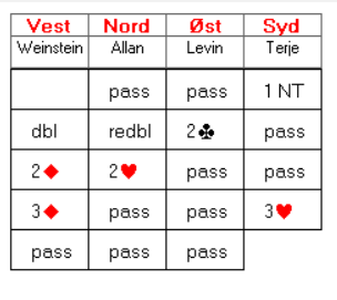 Terje hadde sjansen til å passe 3 ruter. Der blir det fort to beit. Om Norge hadde fått 200 inn ville det blitt 7 IMP til USA. Han meldte imidlertid 3 hjerter, og der gikk Allan 200 i beit i stedet. 12 IMP ut.