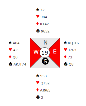 Jeg er «ess-utspiller» mot slem selv om jeg saktens kan innrømme at det ikke alltid er blink. Selv om det av og til gir dem kontrakten er det trolig oftere at du enten kan bete slemmen med essutspillet (får tak i det stikket før taperen deres forsvinner), eller at det er gullkantet i parturnering å få fatt i det ene stikket før det er for sent, i stedet for gi dem overstikk. Slik så hele spillet ut: