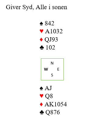 Det er opplagt at du må ha tak i hjerterstikkene for å komme til ni stikk og må forsøke å spille slik at det ikke blir for enkelt å finne ruterskiftet idet de er inne på hjerter ess.