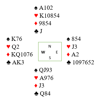 Makker og jeg var med til 3 hjerter etter vests 1 ruteråpning. Det viste seg etterpå at vi kan vinne 4 hjerter, men det er selvsagt ikke noen utgang. Ti stikk i hjerterkontakt kommer kun pga. av at trumfen sitter 2-2 og spar konge i saks. Det her er en delkontrakt, og normalt er det åtte-ni stikk i hjerterkontrakt.