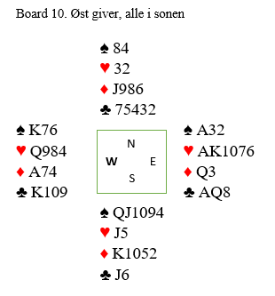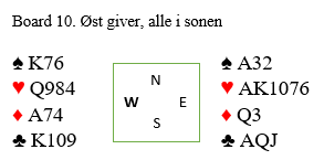 Ved det ene bordet gikk øst bet etter at Ø/V hadde meldt seg opp i 6 hjerter uten en lyd fra N/S.