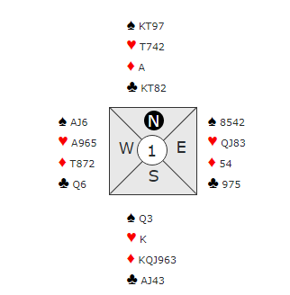 Julecupen var parturnering, og mer enn halvparten av N/S-parene var i 3 grand! I teorien kan Ø/V ta fire hjerterstikk og spar ess, men det er ikke så lett i praksis. Flere steder hvor syd var i 3 grand vant han for hjerter konge i første stikk etter en ikke unaturlig liten hjerter i utspill fra vest. Rasmussen-Gamlemshaug tok toppen for 3 grand med tolv stikk. Flere hadde 460 for 3 grand med elleve stikk, og kun to par gikk bet i 3 grand etter hjerter ut fra øst. To par var i 5 kløver, en vant tolv stikk, og en gikk bet da han bommet kløvervalget.