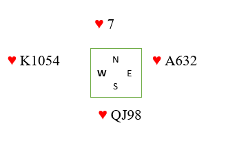 Så toeren må være fra tre gjenværende kort i fargen. Det gir fire hjerter hos syd.