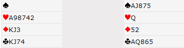 I kløverkontrakte bør det satses på å godspille vest sin hånd. Han som satt øst mot oss spilte godt i 6 kløver. Syd spilte ut hjerter, og naturlig nok lot han ikke den gå til damen da det i så fall er automatisk bet om nord har hjerter konge. Hjerter ess vant første stikk, så hjerterstjeling, kløver til knekten og hjerterstjeling. Siden fargen fortsatt ikke var godspilt måtte han nå spille ruter. Liten fra syd, og...?Selv ville jeg tenkt at siden ruter ess ut er et alternativ har kanskje ikke syd ruter ess? På den annen side, hvis ruter dame sitter hos syd er det et ganske naturlig utspill (umeldt farge) heller enn hjerter unna konge-knekt fjerde? Så han ba om ruter konge. Slik så hele spillet ut: