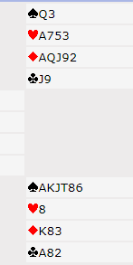 Slike ganger kan det være greit å ha tenkt i gjennom "i-verste-fall"-scenarioet. Aktuelt var det ikke noe "verste-fall"; selv om hjerteren var dårlig både i sør og nord så kan ikke motparten ta mer enn fire stikk i fargen. Videre kan vi se på noen giver der vi leker litt med hjerter-sitsen i øst-vest, og se om det da gjør det verre å melde 1NT fordi hjerteren er svak: