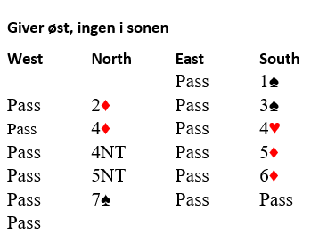Syd valgte altså å hoppe til 3 spar. Nords 4 ruter og syds 4 hjerter var kontrollmeldinger (cuebids), og 4NT Roman Key Card Blackwood. Syd viste 0 eller 3 nøkkelkort, ikke 4 som jeg i halvsøvne skrev da jeg først postet dette innlegget før frokost... Poenget er imidlertid det samme, det må her være 3, dvs. nord "ser" syds A-K i spar og kløver ess. Nå kom 5 grand som er storeslemsinvitt og ber syd vise en konge hvis han har det. Syds 6 ruter viste kongen, og nord kunne telle til tretten stikk (Han kunne nok ha meldt 7 grand som er beste kontrakt, men...).