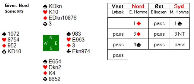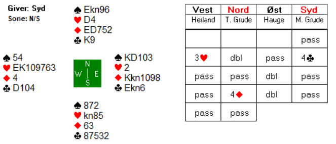 I 4 kløver doblet ble det hele seks beit for -2000 etter at forsvaret fikk to sparstikk, to hjerterstikk og hele seks trumfstikk. Vest fikk ei sparstjeling og to ruterstjelinger, mens øst fikk tre hjerterstjelinger. 300 i differanse ga 7 IMP til Sømnakameratene.