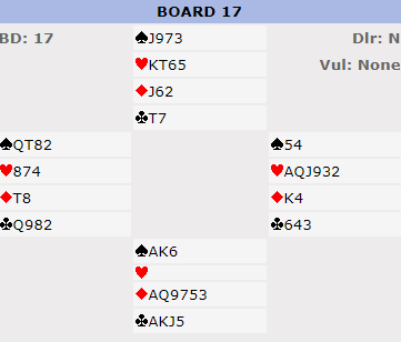 I 6 ruter ved det andre bordet ble det spilt to store kløver og kløver til stjeling. Så hjem til syd via trumffinesse, og den fjerde kløveren måtte forsøkes trumfet nå da det kun var igjen en trumf hos nord. Men øst stjal over, og det ble senere en spartaper - en bet.