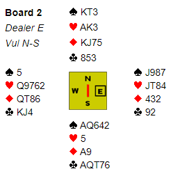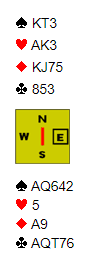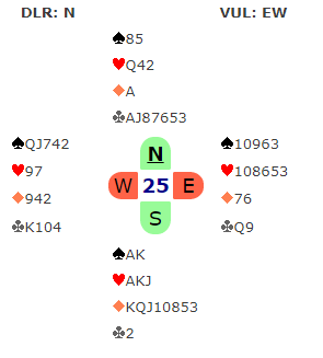 Så kom slemspillet over. Vi meldte 6 grand som jeg skulle spille. Det kom hjerter ut og mer hjerter da kløver til tieren røk til knekten. Dermed talt taket i hodet på meg da den andre kløverfinessen røk – tre bet og nok en tredelt bunn.
