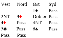 Vest viste da ruter ess med 4 ruter (ikke noe poeng i å kontrollmelde uten det med andre kontroll når makkeren har vist singelton i fargen!), og han viste samtidig ikke noe særlig ekstra. Han kunne etter deres avtaler meldt 3NT (vi skal aldri spille 3NT etter denne starten) med en mer solid sleminvitt, eller med en minimums 2NT som ikke passet så godt mot singelton burde svarhånden bare meldt 4 spar.