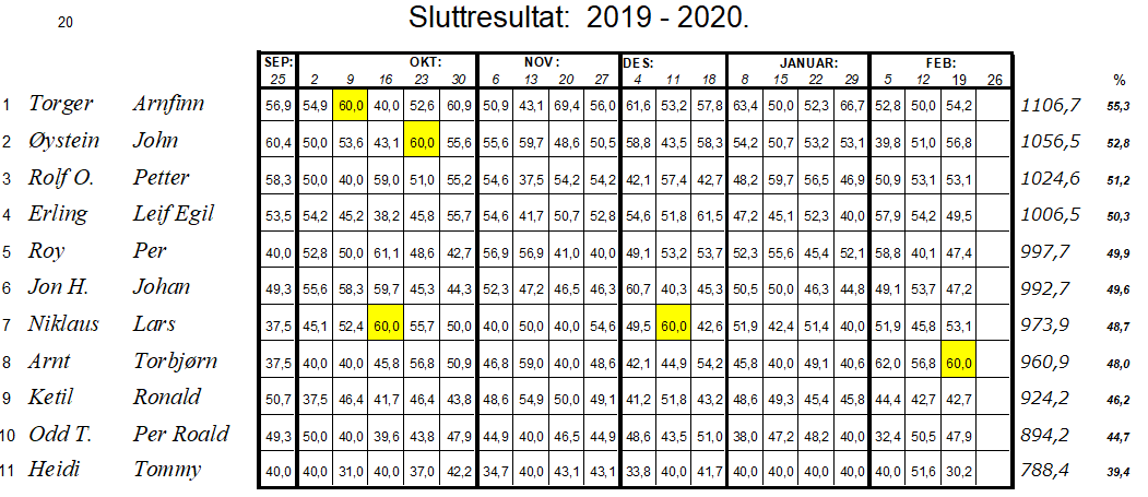 Her er oppdatert status før siste kveld av Bynesmesterskapet 2019-2020:
