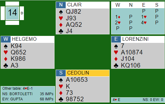 Ved det andre bordet gikk Zia (syd) innpå med 1 spar, og nord sa 2NT som hos dem viser firekorts trumfstøtte (spar) og en bra hånd. Ø/V fikk til slutt spille 4 hjerter ved det bordet også. Zia spilte ut spar ess, og i andre stikk skiftet han til ruter. Dermed var det ingen mulighet for mer enn ni stikk, en bet og 10 IMP til GUPTA. Ved fem av 16 bord føk 4 hjerter hjem, de andre fikk ni stikk.