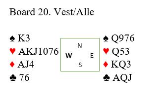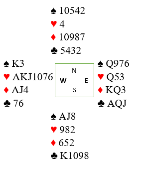 Ø/V har meldt seg opp i 6 hjerter, og N/S har ikke meldt annet enn pass. Nord spiller ut ruter 10.