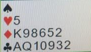 Et spesielt utvidet 5-ess- svar er hopp til 6- trinnet hvis svarhånden har 2 av de 5 essene samt renons i en sidefarge. Men her er jo det i spar som er høyere rangert enn avtalt trumffarge! OK, da betyr hopp til 6 i trumf at man har 2 av 5 ess samt er renons i en farge som er høyere rangert enn trumf. Eureka- da er renonsen i spar! Nå vet Nord at makker har K i hjerter med 5+ kort, ru A og åpning.For at alt skal stå trengs et avkast i ruter eller at Syd har ru D i tillegg til esset. Kl K er også tilstrekkelig for da gir den avkast av en liten ruter på Nord sin hånd. Men er tankene klare for det, altså at Nodt som nå er kaptein våger å melde 7 hjerter?
