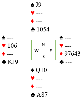 Spillet handler om å plassere kløveren, og da først og fremst hvor kongen sitter. Vest åpnet og har så langt vist 9 HP i hjerter. Han har jo ingen poeng verken i ruter eller spar, så mest sannsynlig sitter kløver konge hos vest. Enkelte åpner riktignok tynt, kanskje med 10 HP hvis de har bra fordeling, og det blir 10 HP på vest om han bare har kløver knekt og ikke kongen. Etter hans åpning i første hånd i ugunstig sone er imidlertid sjansen for at han har kløver konge veldig stor. Det er dog nødvendigvis ikke nok å plassere kongen i fargen. For hva om vest har K-J-x-x i kløver? Du kan selvsagt spille spesifikt på det med esset fulgt av liten til tieren, men det blir nokså dumt om øst har knekten andre. Men hvis du tar for kløver ess og spiller kløver til liten hos vest og damen fra nord går du bet hvis hele spillet ser slik ut fra start: