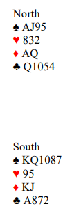Syd er i 4 spar etter at vest har åpnet meldingene med 1 hjerter. Det er en normal utgang med 26 HP til sammen og 5-4 tilpasning, men den er faktisk ikke sikker. Det er fordi N/S har en haug med poeng i 2-2 fargen ruter som altså kun gir to stikk.