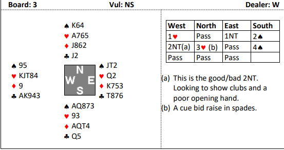 Andre N/S-par fikk sin sjanse til å finne 4 spar ødelagt fordi nord meldte inn 2 ruter. Det er et dårlig valg, opplysende dobling med femkorts minorfarge er å foretrekke når man har bra tilpasning til de andre fargene, og spesielt med fire kort i den umeldte majorfargen. Opplysende dobling er mye mer fleksibelt enn innmelding med denne type kort. Har man femkorts major er det imidlertid generelt bedre å melde den inn med vanlig åpning.