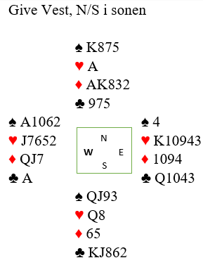 Her får du en spilleprøve som ikke har noen 100% sikker løsning, men det er ikke langt unna. Hvis du plasserer et viktig kort der det mest sannsynlig sitter kan du få til en vakker spilleføring.(Giver vest, Ø/V i sonen)