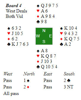 Mot 3 grand kom kløver ut til esset og kløver tilbake før vest tok ett kløverstikk til. Da kastet øst styrkekast i ruter, og vest skiftet til ruter som fikk løpe til østs dame. Det var fire stikk til forsvaret, kanten.
