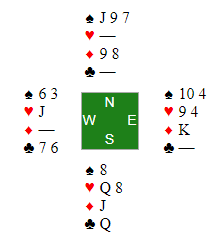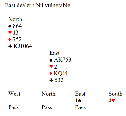 Du sitter altså øst og skal spille mot syds 4 hjerter. Makker spiller ut spar knekt til liten fra nord, din konge og syds toer. Du fortsetter med spar ess, spillefører legger damen og din makker følger med spar 9.