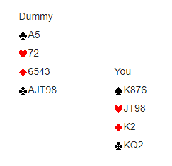 Vest spiller ut ruter dame. Du må stikke over den for ikke å blokkere fargen, og kongen din vinner første stikk. Du spiller en ruter til som vinnes av syds ess, vest legger åtteren. Det følger kløver til knekten som du stikker. Hva spiller du nå?