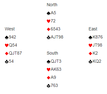 I spillet under er Vest giver og ingen i faresonen. MP, vanlig parberegning. Skjul Øst og Syd sine kort foreløpig. I siste hånd åpner Syd med 1 ruter (4+). Nord svarer 1 hjerter og så går Øst innpå med 1 spar, 5+ og 8+ hp. Syd viser styrke ved å hoppe til 3 ruter, men det går likevel pass rundt. Vest har nå er greit utspill av sp K som vinner stikket. Øst legger styrke ny spar går til esset i Øst og vi vinner også 2. stikk. Fortsettelsen er sp 9. sak av kl 3 fra Syd og Vest kan stjele med ru 7.