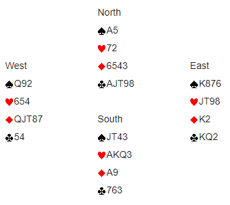 Et nytt eksempel som kanskje er enklere? Syd åpner med 1 grand, makker i Vest passer og Nord melder 2 kløver, Stayman.Du (Øs)t passer og Syd svarer 2 hjerter og Nord deretter 2 grand, men så dør det ut! Du vet at Syd har 15-17 hp, nord inviterte med 8 hp men Syd er har ikke max og heller ikke 4- kort spar, for da ville 3 spar blitt budt. Makker spiller ut ru A, du legger svakhet, men det fortsettes med ru K, der Syd legger 10-eren, og så ru 5, du saker en liten kløver og Syd får for ru D. Nå spiller Syd kl D som dukkes og du vinner med kongen. Vest fulgte med kl 7.