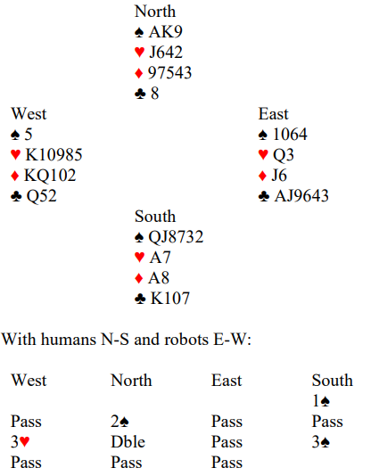 Spillet er opprinnelig fra det polske lagmesterskapet. Ved det ene bordet gikk det 1 spar - 2spar og pass rundt, +170. Ved det andre bordet var syd mer optimistisk, og det startet 1 spar-2 spar før syd sa 3 kløver «lang»fargeinvitt. Nord hoppet til 4 spar som ga +620 til N/S, og det var verd 10 IMP.