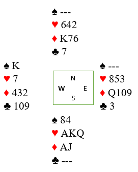 Et merkelig spill, dette. For å vinne ti stikk i hjerterkontrakt med denne sitsen i mot må altså spillefører med sin fete trumfbeholdning komme seg i en situasjon hvor han gir bort ett trumfstikk!