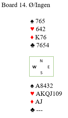 Ved det andre bordet meldte Ø/V direkte dårlig. Vest åpnet med en overvektig 3 kløver (men det viste visst 10-13 og lang kløver), og øst sa 4 hjerter direkte. Spillet gikk fort, og i utgang valgte han trumfe sine ruter hos vest. Da endte det med tretten stikk, Ø/V +710. Det tror jeg nok Ø/V trodde var et tapt spill, men bridge er ikke alltid helt rettferdig.