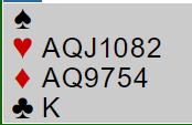 Hvis du åpner med 1 hjerter kan det jo gå pass rundt, og det skal lite til før du får fatt i utgang med disse kortene. Pass rundt skjer ikke nok ikke så ofte når du har slike kort (motparten har som regel også bra fordeling), men selv foretrekker jeg likevel 2 kløver med slikt. I neste melderunde meldes hjerteren.