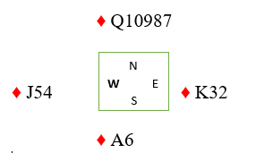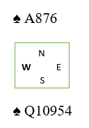 Det er med 4-2 sits det er litt forskjellig prosentsjanse. Hvis en av motstanderne har KJ-fjerde er det likegyldig hva du gjør, han har to stoppere med riktig motspill. Hvis en av dem har K-J dobbel er det også samme hvilken fargebehandling du velger, da blir det fire stikk. Det som gjenstår er kongen dobbel, eller knekten dobbel på en av sidene. Hvis esset spilles fulgt av liten mot nord og vest kommer på med kongen dobbel har øst med knekten fjerde forsvarets andre stopper. Sitter det slik blir det to tapere i fargen også om den andre måten å spille fargen på (damen fra nord). Men hvis esset spilles først fulgt av ruter mot nord og vest følger med et lite kort bør damen spilles fra nord. Hvorfor?