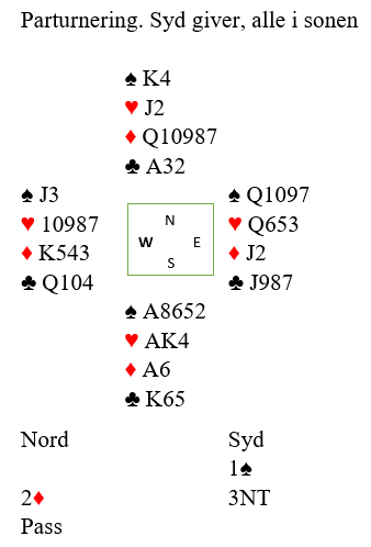 Det er jo noen inntak til nord i dette tilfellet, men ikke nok til at du kan være sikker på å få utnyttet ruterfargen ved å spille damen fra nord, faktisk selv om det faktisk sitter slik her at det teoretisk sett kan bli fire ruterstikk. Se hva som skjer hvis det satses på det: