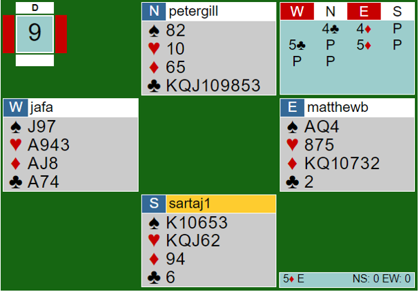 Ved det andre bordet kom Australias Ø/V i 6 ruter etter at nord hadde åpnet med 5 kløver som satte enda større press på Ø/V enn Peter Gills 4 kløver. Det ser ut som om det er to bet i 6 ruter, og blir nok det med hjerter ut. Men det ble kun en bet da spillefører fikk til et lignende sluttspill som Matt gjorde i 5 ruter.