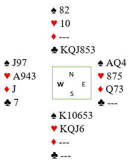 Spar ess ble spilt fulgt av spar dame. Syd stakk med kongen og skiftet til hjerter. Det ser unektelig ut som det vil bli to hjertertapere i tillegg til sparstikket syd allerede har fått, men det er en illusjon hvis spillefører kan sin innspillteori. Hjerter ess vant stikk, så ble den tredje sparen innkassert, og da så det slik ut:
