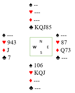 Hvis det spilles på eliminasjon og innspill er det som regel slik at man prøver å bli kvitt alt som er av kort i sidefargene, for eksempel ved å trumfe småkort. Slik er det ikke her, og som du snart skal få se er det faktisk nødvendig å gjemme vests tredje kløver til senere. Dette var blitt situasjonen: