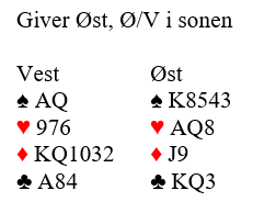 Vi fikk melde i fred. 1 ruter fra meg (S) og svar 1 hjerter fra Arne (N) og så gikk Øst innpå med 2 kløver. Dobling fra meg viste eksakt 3- kort støtte i hjerter og da Marthinussen så hoppet til 3 hjerter viste det 5+ og invitt til utgang. Nå kunne jeg melde 3 spar som kontroll og da Arne kontrollmeldte 4 ruter som må være K eller max 1 kort kunne jeg prøve med 4 NT. Men svaret 5 ruter som viser bare ett av de 5 essene var skuffende. Derfor bøyde jeg av i 5 hjerter med pass fra makker.