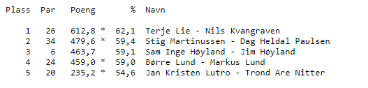 1.Jan Steinar Mydland- Kurt Ellingsen 62,34 %