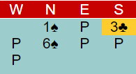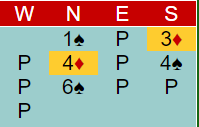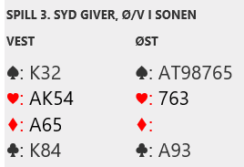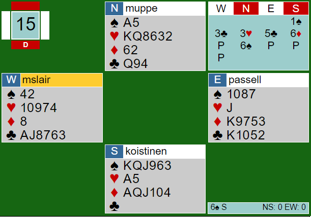 Ved det andre bordet var syd passiv. Etter pass fra han og 1 sterk kløver fra vest fikk Ø/V melde i fred. Den eneste lyden fra N/S var at syd doblet en rutermelding underveis. Ø/V fant ut omtrent alt om kortene og meldte korrekt 6 spar, +1430, og de vant 13 IMP for det.