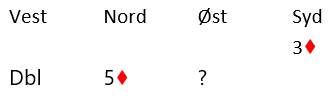 Her møtte vi Arne Jordestedt (N)- Flemming Johnsen (S), Nord påny giver i gunstig sone, og Arne åpnet med 3 kløver! Tone Annette gikk innpå med 3 spar, 4 kløver fra Flemming og jeg synes kortene holt til 4 spar. Så tre ganger pass men Johnsen kjempet videre med 5 kløver. Makker innpå i ugunstig sone på 3- trinnet, der er det kort, og umulig å vite om de andre stamper. Altså dobling fra undertegnede og pass rundt.